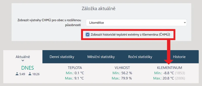 Na záložce „Aktuálně" si nyní můžete nechat zobrazit historické teplotní extrémy z pražského Klementina (zdroj: ČHMÚ , data od roku 1775). Pro každý den v roce uvidíte historické minimum i maximum a můžete tak porovnat aktuální počasí s dlouhodobými záznamy. Funkci zapnete v nastavení čidla na záložce „Zobrazení na webu".